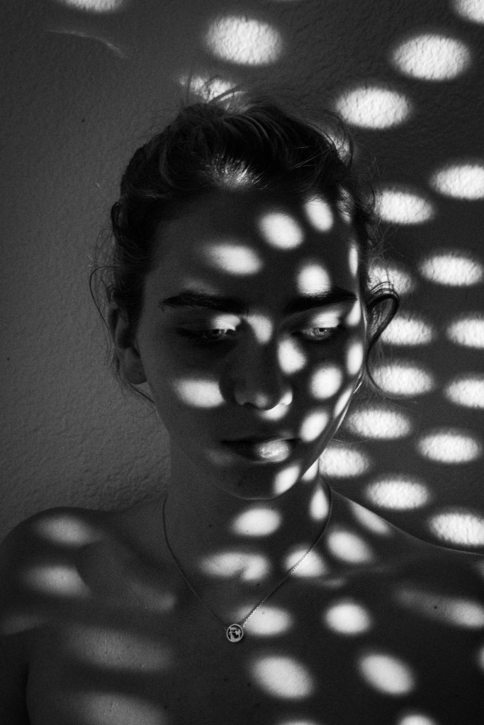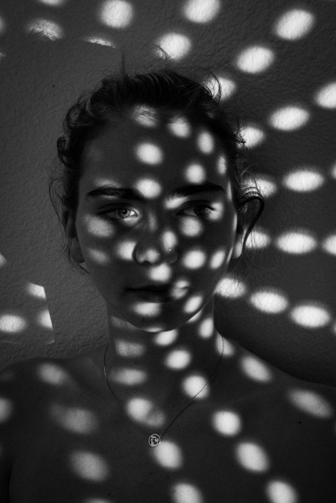 For this project, we were ask to play with light. I used a plastic food drainer to create the patterns, while using the flash light on my iphone. We decided to take the photos in my bathroom since it is darker in there. It was pretty hard figuring out the right settings on my camera, since the shutter speed was really slow in the beginning, but once we figured that out it was really fun trying to find the best angle and position to photograph her. I decided to make it black and white to emphasis the light more so the colors won’t be to distracting. Overall, it was a really fun project to photograph!